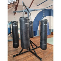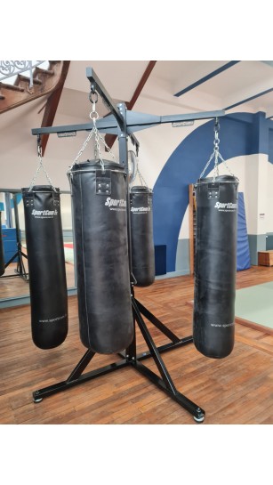 Our SPORTCOM Freestanding 4-bag station is perfect for shared rooms, where there is no possibility to install a fixed gallows. This bracket has 4 slots for punching bags. It is also possible to add a speed platform ans a ball with double elastic bands, which makes this stand versatile. As with the fixed stems, the innovative swivel ring system extends the life of this bracket and guarantees high resistance.